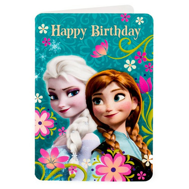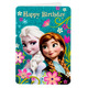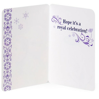 - This Frozen-themed gift bag features Anna on one side and Elsa on the other with pink flower accents and the castle in the background with a pink cord handle. Cover Message: Happy Birthday. Inside Message: Hope it's a royal celebration
