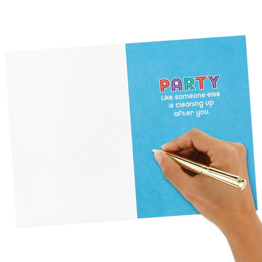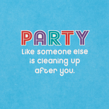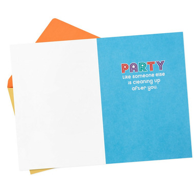 • Cover features colorful "It's your birthday" lettering, accented with foil, and a photo of a dog eating a birthday cake. Inside reads: "Party like someone else is cleaning up after you."