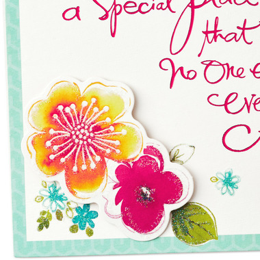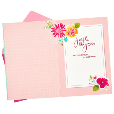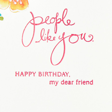 - Cover features a pretty floral design and metallic foil lettering that reads: "There are people in our lives who hold a special place that no one else ever could . . ." Inside reads: "People like you. Happy birthday, my dear friend."