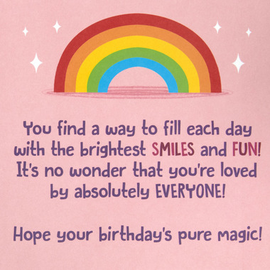 • Inside reads: "You find a way to fill each day with the brightest smiles and fun! It's no wonder that you're loved by absolutely everyone! Hope your birthday's pure magic!"