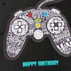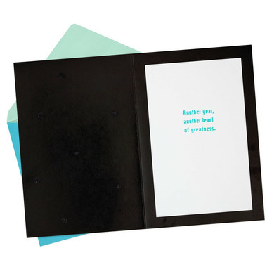 - Front features a video game controller with white lettering on a black background with subtle sparkly accents and reads "Happy Birthday." Inside reads: "Another year, another level of greatness."
