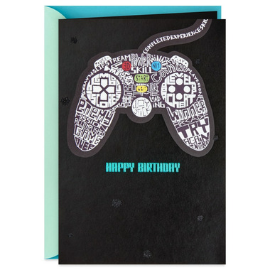 This birthday card is a fun way to wish a gamer in your life well on their special day. With an intricately designed video game controller on the front, and a punny message inside, it's sure to please your brother, boyfriend, son, or anyone who can't get enough video games. The Hallmark brand is widely recognized as the very best for greeting cards, gift wrap, and more. For more than 100 years, Hallmark has been helping its customers make everyday moments more beautiful and celebrations more joyful.