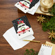Holiday cards feature a snowy vintage red truck piled high with presents, accented with glitter and foil. License plate reads: "Merry."