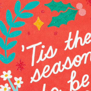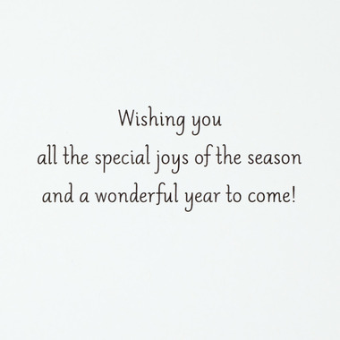• Holiday cards feature flowers, holiday greenery, stars, and ornaments accented with glitter. Message reads: "'Tis the season to be joyful." Inside reads: "Wishing you all the special joys of the season and a wonderful year to come!"