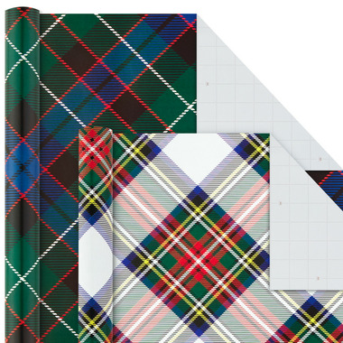 Four rolls of Christmas wrapping paper in stunning tartan plaid designs with holiday colors including red, green, black, white, blue and yellow. Each roll measures 30" wide by 16 feet long for a total of 40 square feet per roll. 120 total square feet in the set. Multi-pack of traditional plaid gift wrap with plenty of square footage to wrap several gifts. Each roll features grid lines on the reverse side for straight cutting and perfectly wrapped presents. The Hallmark brand is widely recognized as the very best for greeting cards, gift wrap, and more. For more than 100 years, Hallmark has been helping its customers make everyday moments more beautiful and celebrations more joyful.