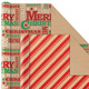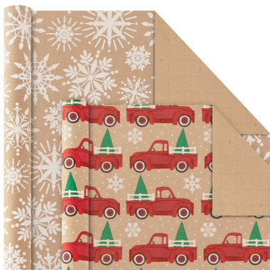 Four-pack of Christmas wrapping paper in 4 festive holiday designs on brown kraft paper: Vintage red trucks, red diagonal stripes, white snowflakes, "Merry Christmas" in red and green.