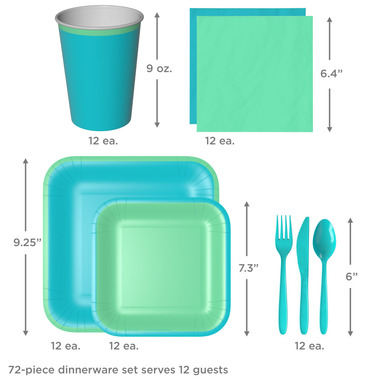 - SERVES 12 GUESTS: Set of party supplies for 12 people includes 9.2" square dinner plates, 7.3" square dessert plates, 9 ounce paper cups, 6.4" paper napkins, and plastic forks, knives and spoons. Plates are not for microwave use; Do not place in microwave