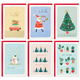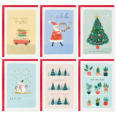 - Assorted boxed set includes 6 modern designs with cute holiday imagery including Santa Claus, a snowman, Christmas trees, red bus, and houseplants on pink, blue, yellow and sage green backgrounds with gold accents