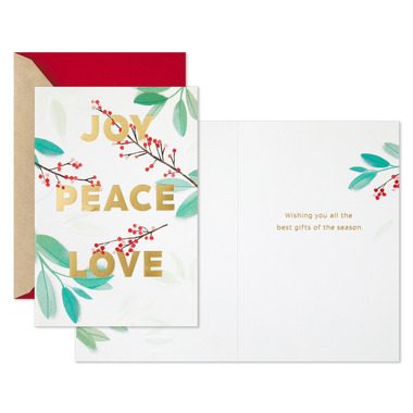 - Card 2: Leaves with gold "JOY, PEACE, LOVE"; inside reads: "Wishing you all the best gifts of the season."