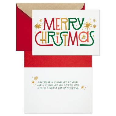 - Card 3: "Merry Christmas" in pink, red, gold & green; inside reads: "You bring a whole lot of love and a whole lot of joy into my life. And I'm a whole lot of thankful!"