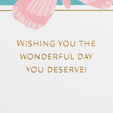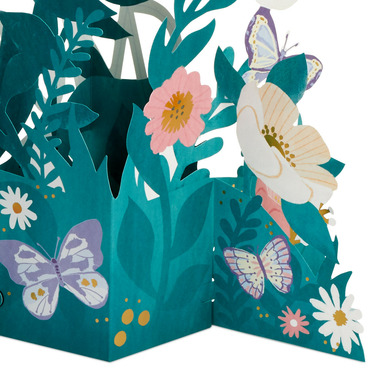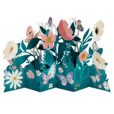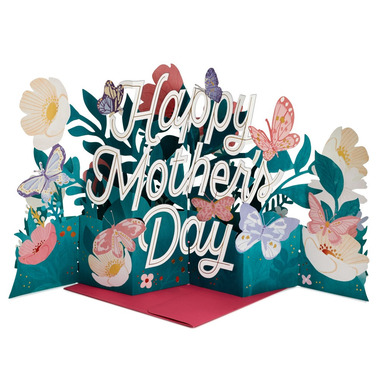 This Hallmark Paper Wonder Displayable Jumbo Mother's Day Card has an accordion fold that serves as a floral table centerpiece when opened. Card message: Happy Mother's Day; Wishing you the wonderful day you deserve!