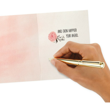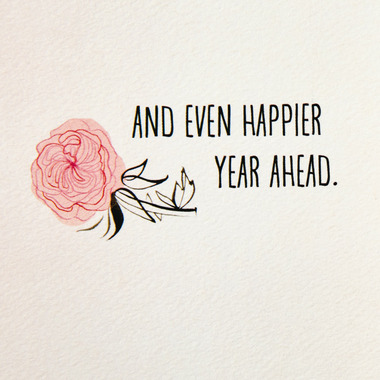 - Cover features a pretty painted floral design with gold foil accents and lettering that reads, "Happy birthday." Inside reads: " and even happier year ahead."