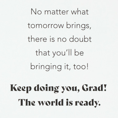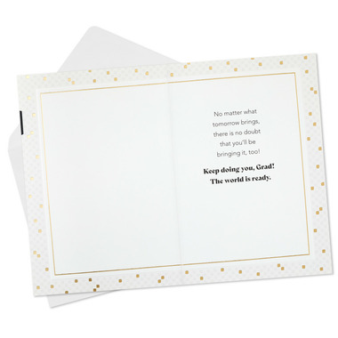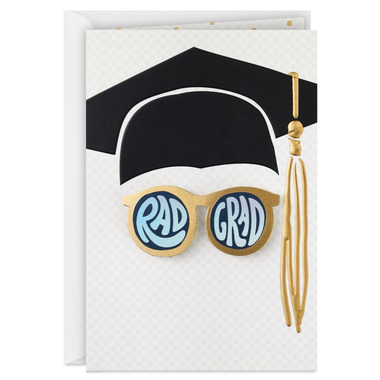 This Hallmark Graduation card features a black graduation cap with gold tassel and gold sunglasses that read, "Rad Grad" Inside reads: "No matter what tomorrow brings, there is no doubt that you'll be bringing it, too! Keep doing you, Grad! The world is ready."