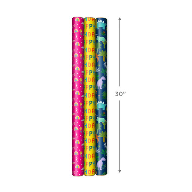 Celebrate birthdays, baby showers and everyday special occasions with fun kids wrapping paper! Set includes 3 rolls, each with a unique design: Pink with rainbows, hearts and clouds, yellow with "Happy Birthday" lettering, and navy blue with dinosaurs like a T-Rex, stegosaurus, pterodactyl and more. Each roll of gift wrap features grid lines on the reverse side for straight cutting and perfectly wrapped presents. Great to have on hand for birthdays for kids, grandchildren, nieces, nephews, classmates and kids at heart. The Hallmark brand is widely recognized as the very best for greeting cards, gift wrap, and more. For more than 100 years, Hallmark has been helping its customers make everyday moments more beautiful and celebrations more joyful.