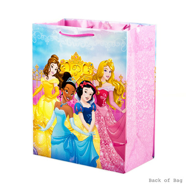 This Disney Princess-themed gift bag features Ariel, Cinderella, Rapunzel, and Merida on one side and Belle, Tiana, Aurora, and Snow White on the other side. It comes complete with a pink cord handle, white tissue paper, and a coordinating birthday card that reads, "You're the birthday princess! Happy birthday." It can hold books, clothing, stuffed animals, puzzles, toys or dolls. This large gift bag measures 10.47" x 13" x 5.75".