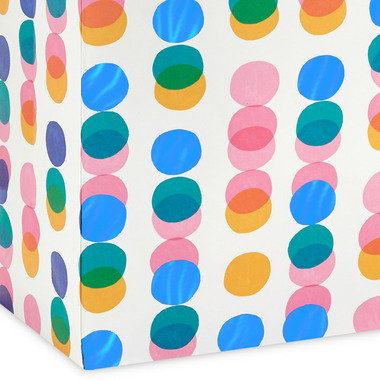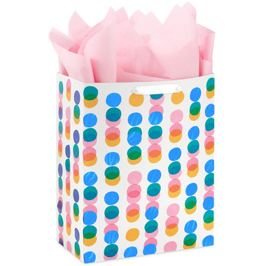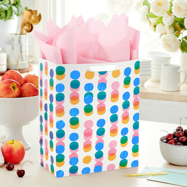 Wrap a birthday, Mother's Day or Easter present in this cheerful gift bag with tissue paper. Colourful, overlapping dots design adds a cheerful touch to any gift. Large bags hold gifts like toys, stuffed animals, books, puzzles, clothing items and more.