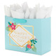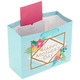 Perfect for holding books, clothing, travel mugs, picture frames or a collection of smaller items, this wide gift bag measures 13" wide by 10.47" high by 5.75" deep. This all-in-one gift wrap solution features aqua ribbon handles, card pocket and 3 sheets of white tissue paper to make wrapping gifts for mom quick and easy.
