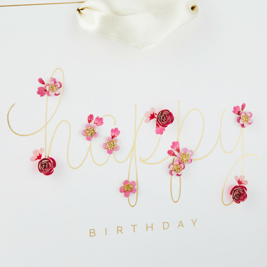 - Beautifully designed gift bag features a gold foil border and "Happy birthday" lettering, accented with laser cut pink flower attachments