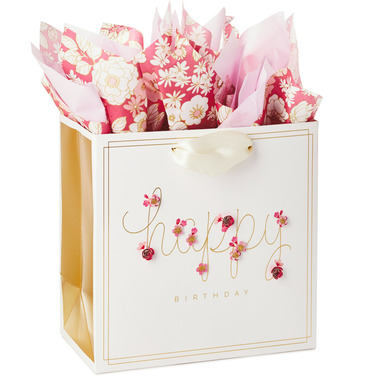 Featuring an embellished gold foil design and satin ribbon handles, this medium gift bag is a festive way to celebrate a friend or family member's birthday. Fun design makes this bag appropriate for any occasion. All-in-one gift bag and tissue paper set makes wrapping presents quick and easy. Pair this gift bag with a Hallmark birthday card to personalize your gift and write a sweet note to the birthday girl.