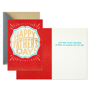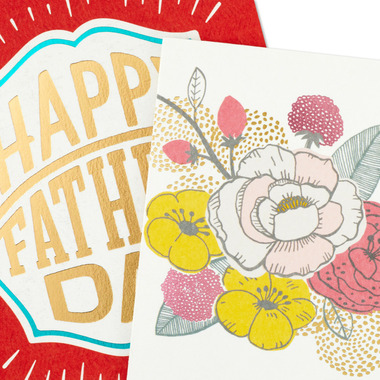This Hallmark Mother's Day card features a pretty floral design and gold foil "Happy Mother's Day" lettering. Inside reads: "Hope your day is as wonderful as you." The Father's Day card features bold "Happy Father's Day" lettering on a red patterned background. Inside reads: "Just your yearly reminder of what an amazing dad you are."