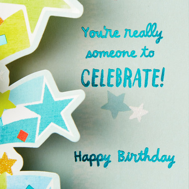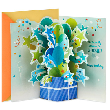 - Open the card for a surprise 3D pop up of an exploding box and the message: "You're really someone to celebrate! Happy birthday."