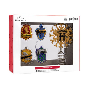 Delight the Harry Potter fans in your house with this miniature Hallmark Christmas tree topper and ornaments. Perfect for a tabletop Christmas tree, the decorative accessories feature Hogwarts house designs.
