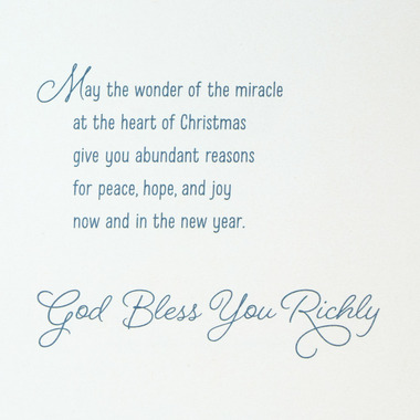 - Inside reads: "May the wonder of the miracle at the heart of Christmas give you abundant reasons for peace, hope, and joy now and in the new year. God bless you richly."