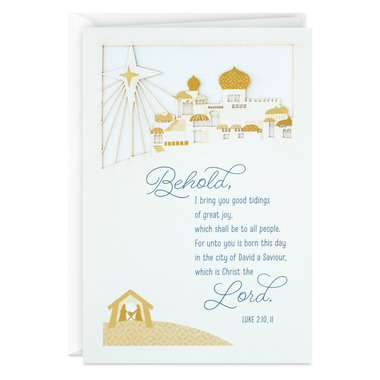 - Die cut cover features a glittery Bethlehem design. Message reads: "Behold, I bring you good tidings of great joy, which shall be to all people. For unto you is born this day in the city of David a Saviour, which is Christ the Lord. Luke 2:10, 11."