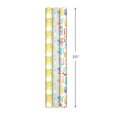Perfect for first birthdays, baby showers, baptisms and more, this 3-pack of reversible wrapping paper features 6 colorful designs, including ABCs, clouds, bottles, polka dots, gingham and solid light blue. Each roll has 25 square feet of gift wrap, for a total of 75 square feet in the set. Versatile, coordinated designs easily elevate gifts for occasions throughout the year. The Hallmark brand is widely recognized as the very best for greeting cards, gift wrap, and more. For more than 100 years, Hallmark has been helping its customers make everyday moments more beautiful and celebrations more joyful.