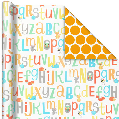 - VERSATILE DESIGNS: Each roll of baby wrapping paper has 2 adorable designs: ABCs with animals / orange polka dots; Clouds with raindrops on yellow / solid light blue; Rattles and bottles on gray / Grey and white gingham