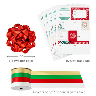 Includes: 3 rolls of wrapping paper (90 square feet total), 5 red bows, 5 gold bows, 40 gift tag stickers and 4 colours of curling ribbon with 12 yards each (red, green, white, gold).