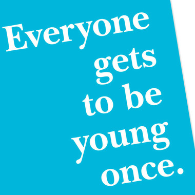 - Cover features white lettering on a blue background that reads: "Everyone gets to be young once." Inside reads: "Your turn's over."