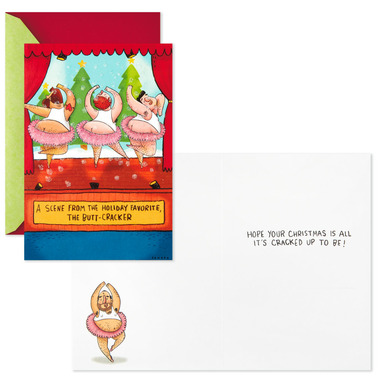 - This pack of Christmas cards includes five unique designs featuring classic holiday icons like Santa Claus, buff snowmen, and the butt-cracker er, Nutcracker, and hilarious sentiments
