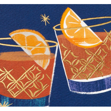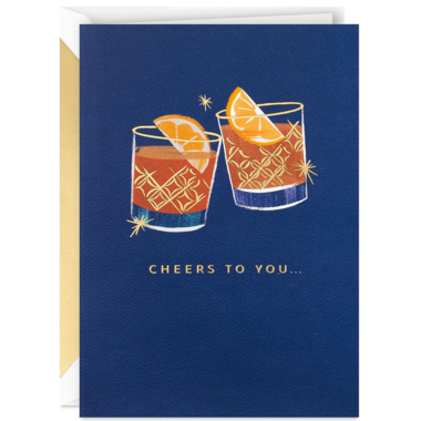 - Cover features clinking rocks glasses, and gold foil lettering that reads: "Cheers to you . . ."