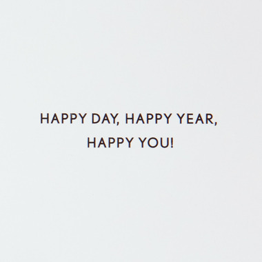 - Cover features colorful Mylar balloons spelling "Happy" on a background of patterned polka dots. Inside reads: "Happy day, happy year, happy you!"
