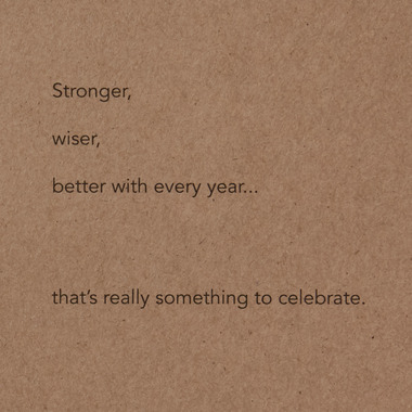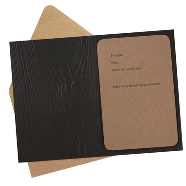 - Front features a stag head attachment made of cut layered paper on a dark wood grain background. Inside reads: "Stronger, wiser, better with every year... That's really something to celebrate."