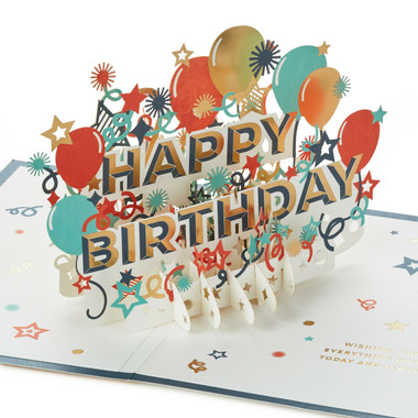 - Inside features an elaborate surprise pop-up of "Happy birthday" lettering, accented with colourful balloons and confetti