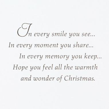 - Inside reads: "In every smile you see . . . in every moment you share . . . in every memory you keep . . . Hope you feel all the warmth and wonder of Christmas."