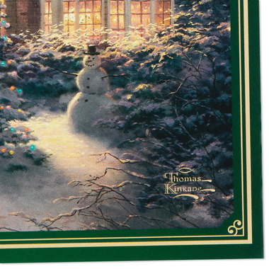 - Holiday cards feature a Thomas Kinkade painting of a snowy house decorated with Christmas lights, complete with a snowman in the yard.
