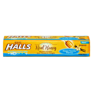 Halls Mentho-Lyptus Drops Honey Vanilla temporarily relieves coughs, minor irritations or sore throat.