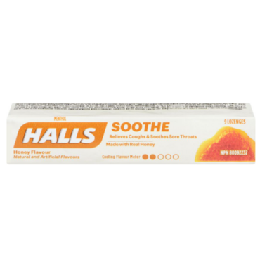 Halls Soothe made with real honey for the temporary relief of coughs and sore throat.