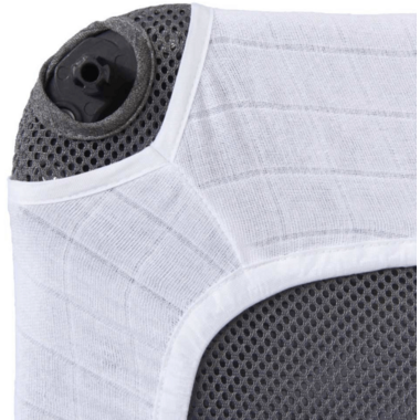 The fitted sheet is made out of 100% cotton muslin, which allows for open air flow. It is uniquely designed to fit the HALOTM DreamNestTM breathable mesh mattress. Sheet corners accommodate cot legs, so fitted sheet can be used with all configurations of DreamNest: rocking bassinet, portable crib, and travel cot.