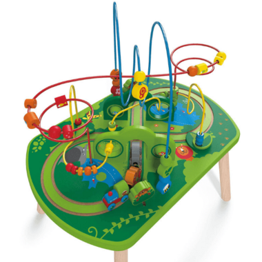 Adventure awaits on this knee-high table from the forest floor to the jungle canopy tree-tops! A jungle train winds its way through the underbrush as monkeys and parrots leap and flutter through the dense bead maze forest above. It"s an adventure for plenty of human friends and jungle playmates alike! Recommended for 18+ months.