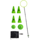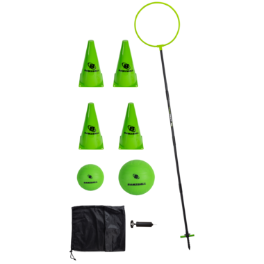 Includes 21" diameter ring on an adjustable 72" pole, ground stake, 2 inflatable balls (4" and 7" diameter), 4 boundary cones, air pump, and rule book.