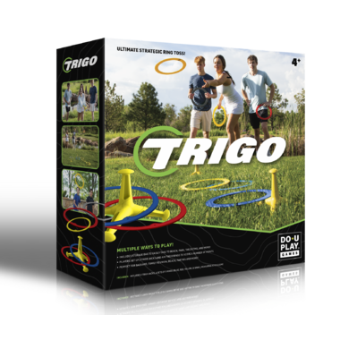Includes 3 Trigo stars, 4 sets of 3 rings (blue, red, yellow, grey), storage bag, throw line, and measuring stick.