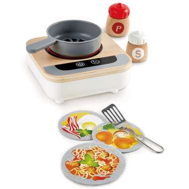Learn to cook with this realistic stove with frying pan. Works with an inbuilt fan which makes the food turn in the pan like it's bubbling, sizzling or frying. No heat! Includes six recipes on three felt discs, one metal spatula and a set of salt and pepper shakers which click when the tops are turned.