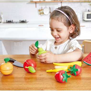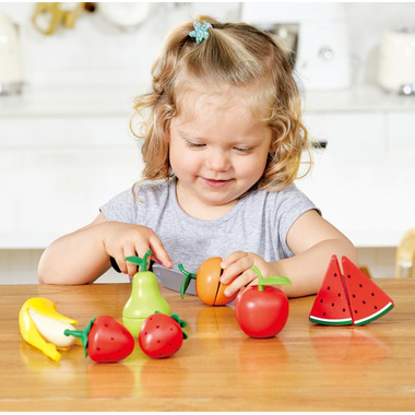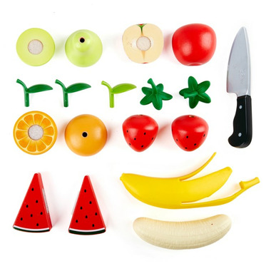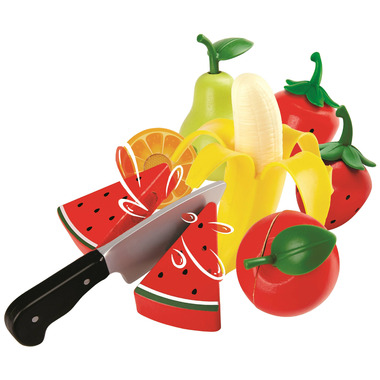 Get used to eating healthily with this cute fruit set. Includes one realistic play knife, two strawberries, one pear, one orange, one apple, with removable stalks and one slice of watermelon all of which can be sliced with the realistic play knife and one peelable banana.