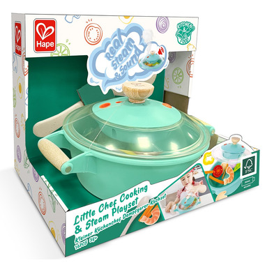 Place your food into the pot and stir with the spoon to let it steam. Then put on the lid and press the button to hear the cooking sounds! Add a few drops of water and soon you'll see a cool mist rising from the pot just like real steam!