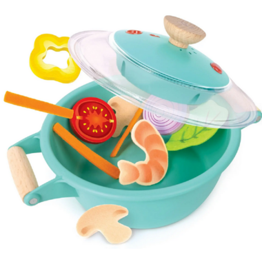 - 14 pieces of play food, including tomato, union, pepper, lettuce, mushroom, shrimp, shredded carrot, a spoon and a water dropper.