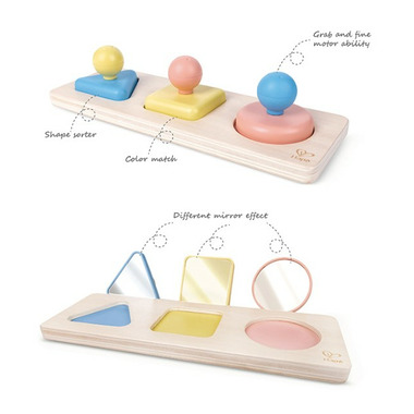 Have fun while you learn with this fantastic Montessori puzzle. Featuring three shapes with mirrors for you to put in the right place. Made from eco-friendly rice material, the shapes are soft to the touch and even have a pleasant smell!